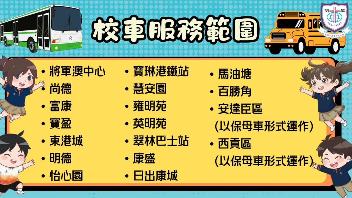 本校設有校車服務,主要服務將軍澳區。以下為本年度校車途經路線: